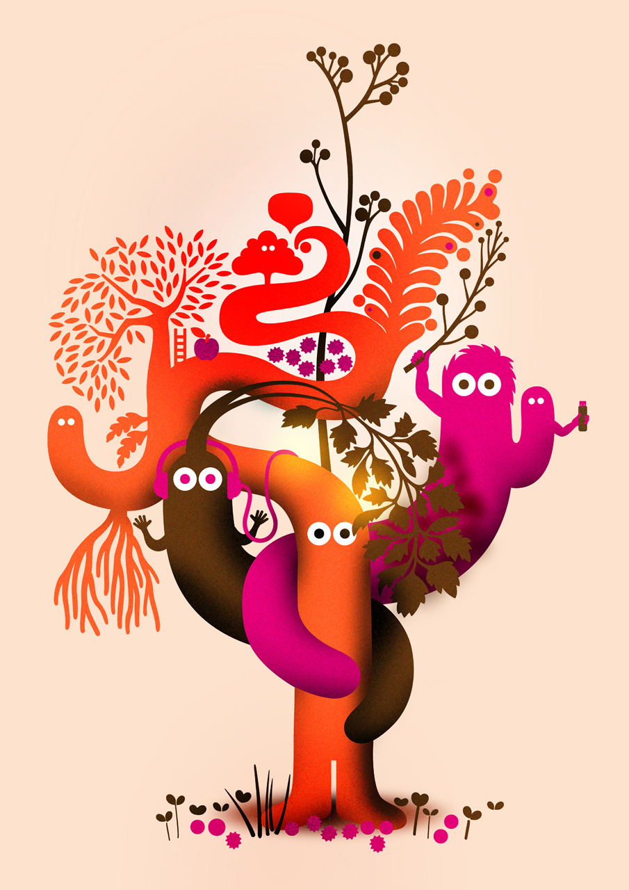(Lucas López) Según su propia definición la pequeña Geneviève Gauckler “hace figuras”. Sin embargo, su estantería de character designs excede el tag: una plaga de peluches dentados, babosas plastificadas, cerebritos pictoplasmáticos y emoticones redondeados que sonríen, se estiran y se reducen de forma ambigua, “todos diferentes pero parte de una misma gran familia”. Con influencia del universo kawaii, las líneas orgánicas y el relato naïve, el paisaje onírico de Gauckler plantea una organización del espacio digno de estudio. En su proceso, la ilustradora no hace una regresión estereotipada a la infancia (trazos sin terminar, ocurrencias escolares y la sensación permanente de no haber crecido), sino que se sumerge en la búsqueda intransigente de una narrativa personal, que delinea los confines de su propia cosmogonía, como su admirado Hayao Miyazaki. Otros nombres que complementan el bagaje de gustos de Geneviève son dignos de mención: Rinzen, Parra, Laurent Fetis. El resto forma parte de esa gran cooperativa incansable llamada Big Active, donde también colabora (Kam Tang, Mat Maitland). En el caso de Matt Groening, la ilustradora admira sus primeras obras en blanco y negro como Life is Hell y School is Hell.