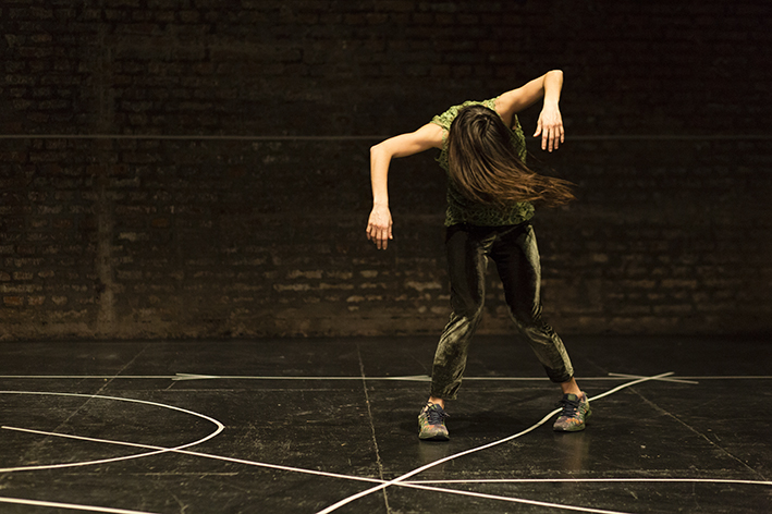 Pero entonces, ¿cuál es la relación entre lo previsto y lo que hacemos? Los límites establecidos con cinta de papel por todo el espacio ayudan a desarrollar una danza que, por momentos, se guía por lo dispuesto y, por otros, lo pone a prueba. El cuerpo prueba cambiar de planos, de direcciones, salirse de las marcas, romperlas. Al mismo tiempo, el espacio marcado es lo único que permanece mientras el cuerpo genera una imagen tras otra, desvaneciéndolas al instante. La inscripción en cinta es, para nosotrxs también, una referencia. Aquello que nos permite organizar ese discurrir incesante según nuestras propias lógicas, evocar secuencias y anticipar otras, hacer nuestro propio ensayo mental.