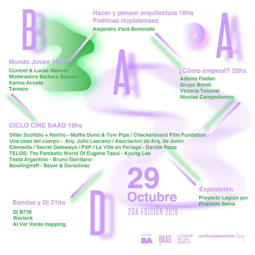 BAAD es un espacio joven que tendrá lugar en el marco del Festival Internacional de Diseño y La Noche de los Museos, con el fin de mostrar las claves y consejos sobre cómo exitosos profesionales siguen forjando su camino, haciéndolos cómplice viviente de una continua y constante búsqueda llamada: realización propia.